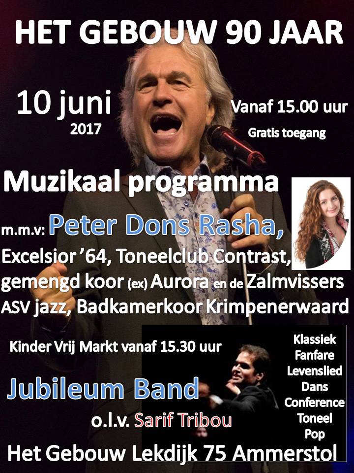 Met een jubileumprogramma zet het bestuur het 90-jarig jubileum luister bij. Zaterdag 10 juni is er vanaf 15.00 uur een uitgebreid feestprogramma met o.a. diverse optredens binnen en buiten Het Gebouw, een kindervrijmarkt en demonstraties, gevolgd door een korte toneelvoorstelling van Contrast in de grote zaal en een feestavond. Peter zal tussen 18:00 – 21:20 uur een aantal optredens doen tijdens dit gezellige spectacel.