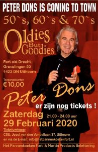 Op zaterdag 29 februari 2020 is Peter Dons te zien en te horen op een unieke locatie en wel het pannenkoekenfort te Uithoorn. Vanaf 21:00 uur zal hij daar een programma brengen van liedjes uit de #fifities #sixties en #seventies. Een scala van bekende liedjes uit die tijd zullen deze avond de revue passeren, van The Everly Brothers tot Christie, The Rolling Sones tot The Kinks, niets is hem te dol. Wilt u daar ook bij zijn, reserveer dan snel en bestel uw tickets á € 10,00 bij Het Pannenkoekenfort, info@hetpannenkoekenfort of bij Martin Products Belettering info@martinproducts.nl