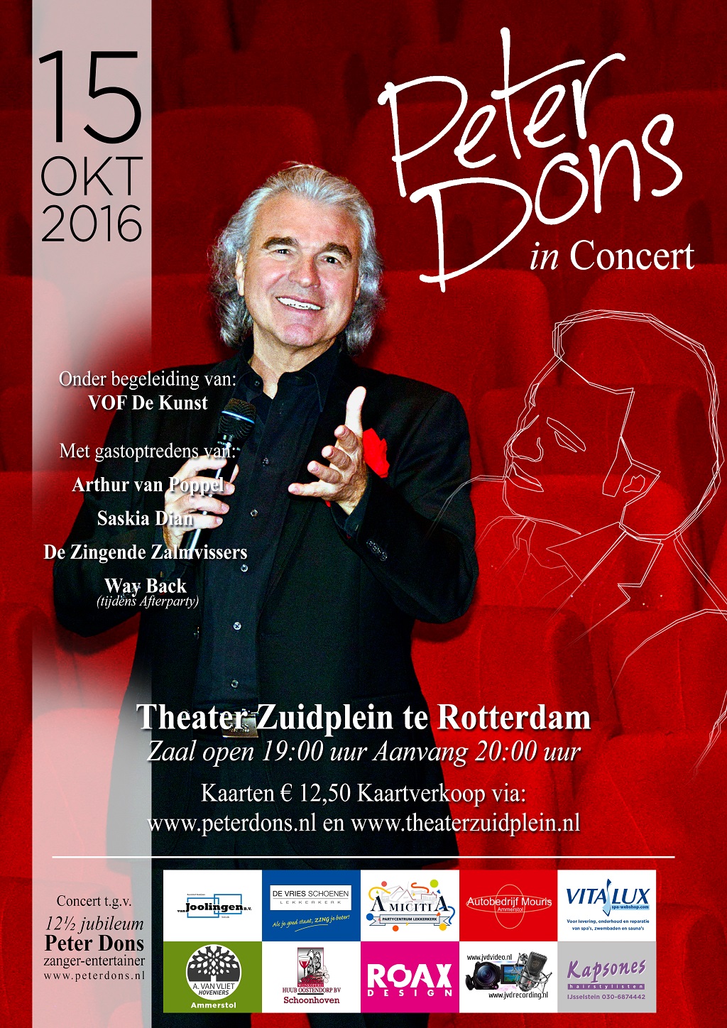 Vandaag, vrijdag 1 april 2016, start officieel de kaartverkoop voor de jubileumshow “Peter Dons in Concert” van Peter Dons in theater Zuidplein te Rotterdam op zaterdag 15 oktober a.s. Kaarten zijn ad € 12,50 te verkrijgen via www.peterdons.nl/peter-dons-in-concert-oktober-2016 en www.theaterzuidplein.nl Peter zal deze avond begeleidt worden door een 11 koppige band waaronder basisband van VOF De Kunst (www.vofdekunst.nl). Verder zullen Saskia Dian (www.saskiadian.nl) , Arthur van Poppel ( www.muziekkunstenaar.nl) en De Zingende Zalmvissers (www.dezingendezalmvissers.nl) een bijdrage aan deze jubileumshow geven en zal de band Wayback (www.wayback.nl) uit Delft de afterparty verzorgen. Deze afterparty zal, bij voldoende belangstelling, tot in de kleine uurtjes duren.