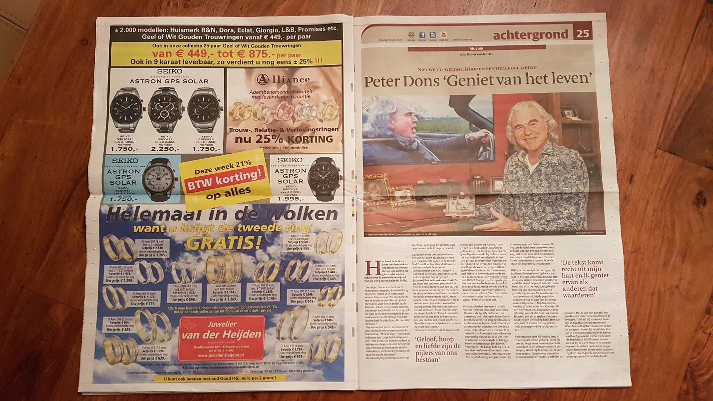 Ook de regionale bladen schenken aandacht aan het nieuwe album van Peter Dons “GELOOF, HOOP EN EEN HELEBOEL LIEFDE”. Op woensdag 19 april j.l. stond er een paginagroot redactioneel stuk in Het Kontakt, over het nieuwe album en hoe alles tot stand is gekomen. Het Kontakt is een huis aan huis blad in de Krimpener en Lopikerwaard. In dit redactioneel stuk is precies verwoord wat Peter bezighoudt, wat er allemaal vooraf is gegaan voordat het zover is gekomen, zijn wensen, bez