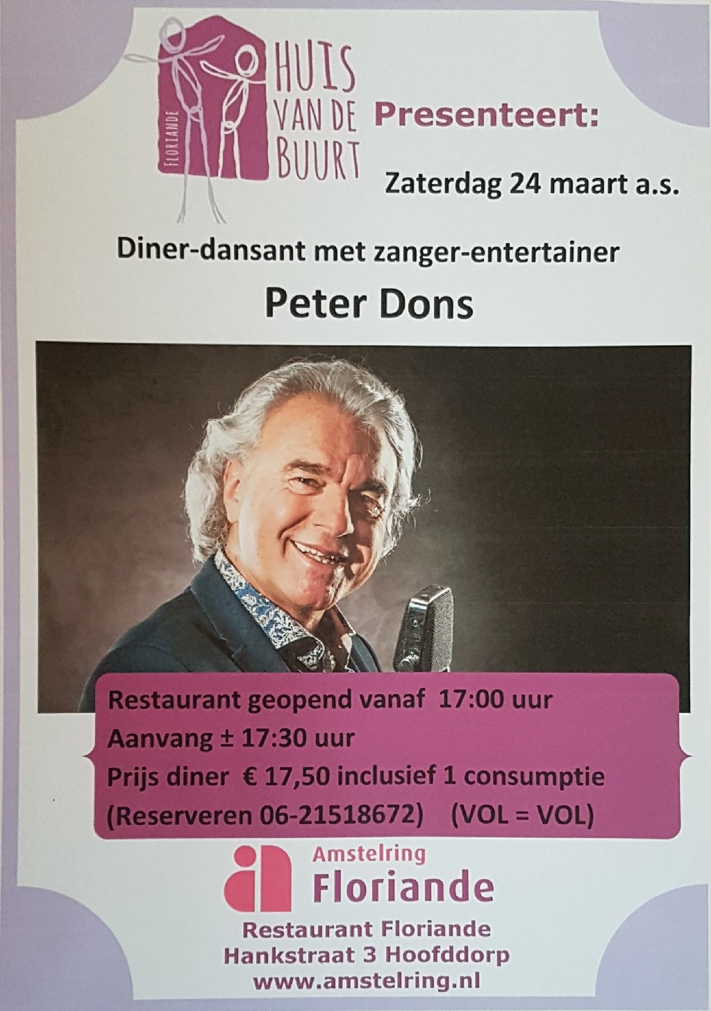 Zaterdag 24 maart a.s. zal ik een optreden verzorgen tijdens het diner-dansant in Huis van de Buurt in Hoofddorp. De prijs van deze avond is € 17,50 inclusief 1 consumptie. Zaal open vanaf 17:00 uur en aanvang diner ±17:30 uur. Reserveren bij Dominique Gerbracht onder nummer 06-21518672 VOL=VOL.